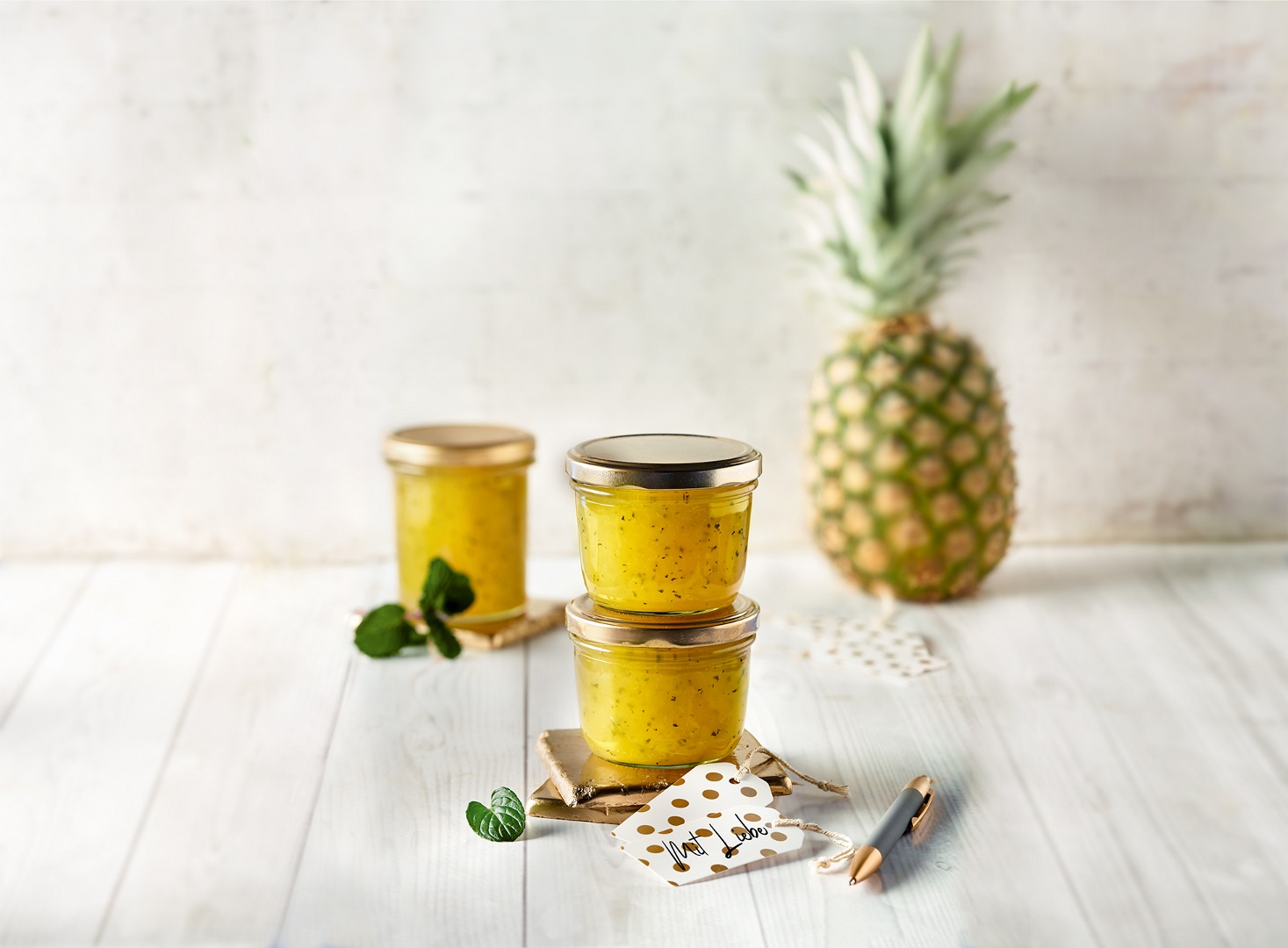 Für die Zubereitung des Rezeptes im normalen Kochtopf Minze hacken. Ananas-Fruchtfleisch pürieren und 1 kg Fruchtpüree mit 500 g klassischem Diamant Gelierzucker 2:1 in einem großen Topf mischen. Unter Rühren zum Kochen bringen und bei starker Hitze unter Rühren 3 Minuten sprudelnd kochen lassen. In Gläser füllen, pro Glas etwas gehackte Minze unterrühren und gut verschließen.