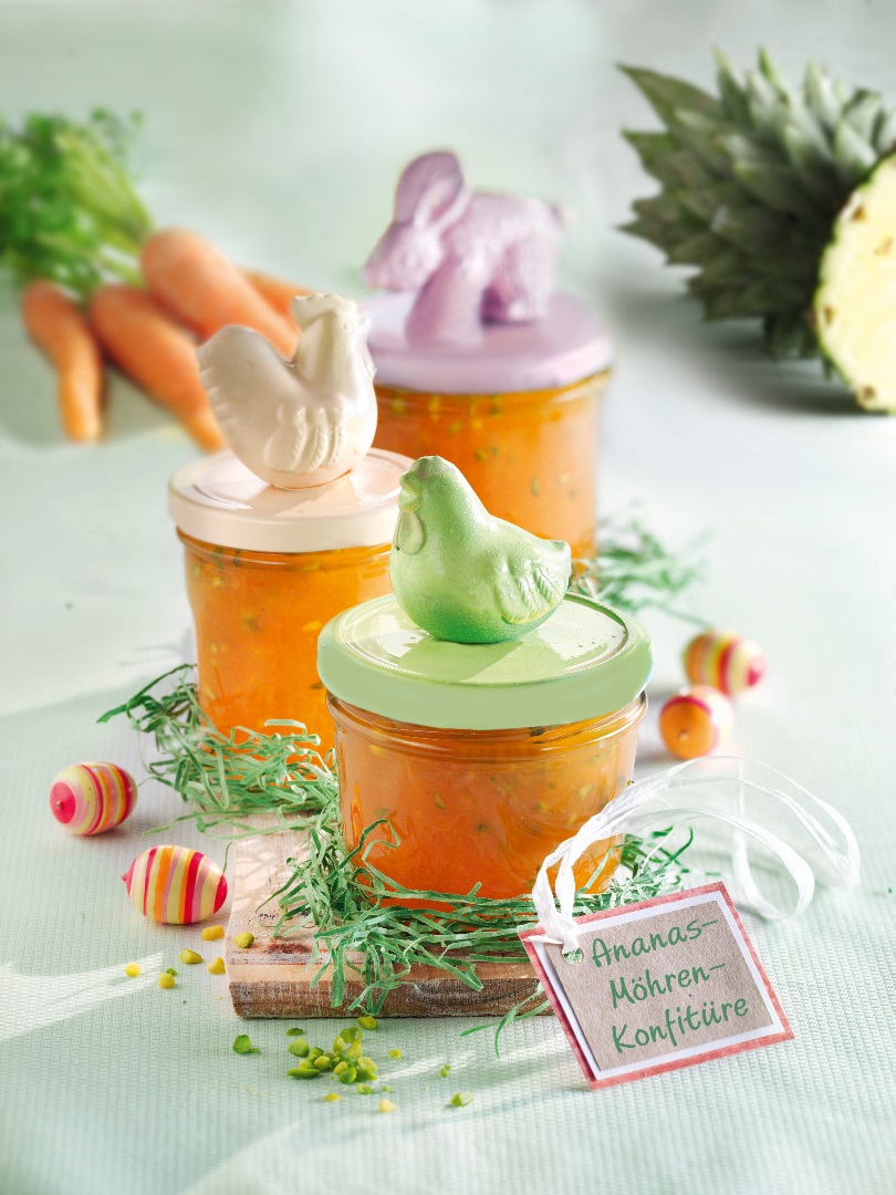 Bastelanleitung für die Gläser: • Von gebrauchten Gläsern (z. B. für Marmelade, Honig o. ä.) die Etiketten entfernen. • Gläser und Deckel gründlich ausspülen und trocknen. • Häschen, Hähne, Hühner (z. B. Spielzeugfiguren) oder andere passende österliche Dekoration mit Bastel- oder Heißkleber auf den Deckel des Glases kleben und gut trocknen lassen. • Deckel sowie Figur mit Wunschfarbe ansprühen oder anmalen und ebenfalls gut trocknen lassen.
