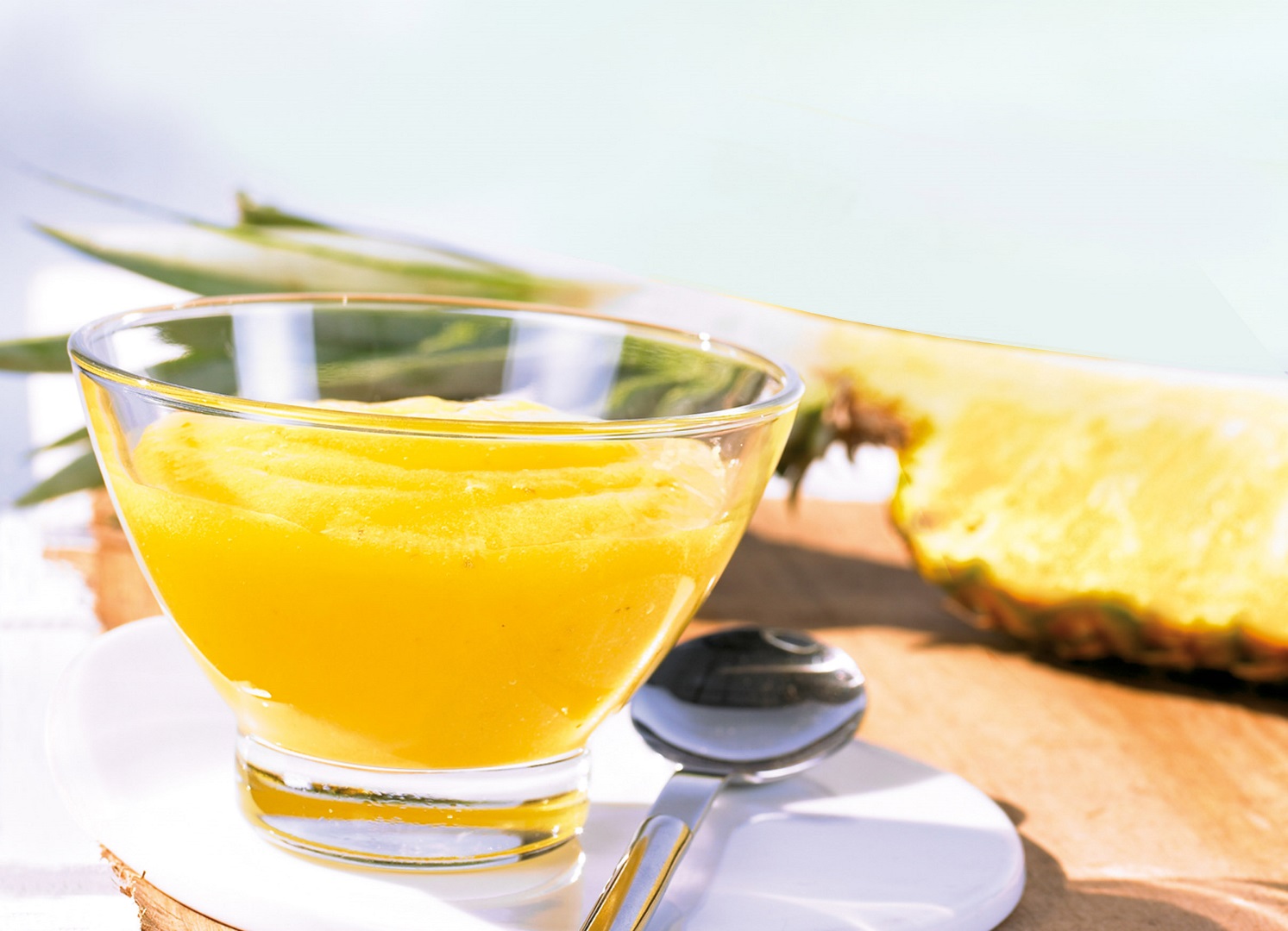 Ananas schälen, Fruchtfleisch vom Kern schneiden und 125 g abwiegen. Apfel schälen, Kerngehäuse entfernen und 75 g abwiegen. Obst in Stücke schneiden und mit Orangensaft und Amaretto in ein hohes Gefäß geben.