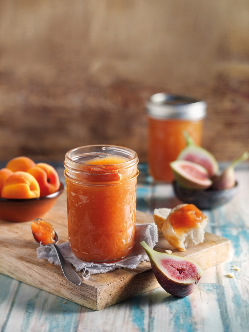 Früchte waschen. Aprikosen entsteinen, Feigen putzen. Beides in Stücke schneiden, pürieren und insgesamt 1,5 kg abwiegen.