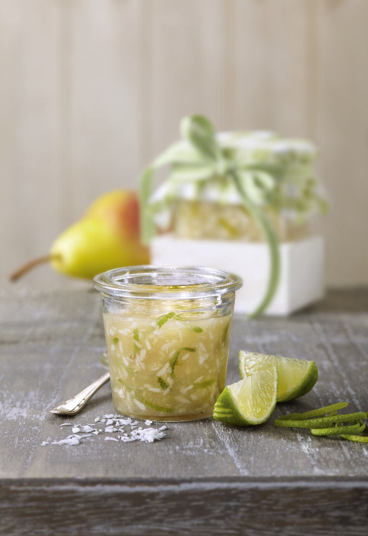 Birnen waschen, nach Geschmack schälen und würfeln. 250 g abwiegen und mit Limettensaft in ein hohes Gefäß geben. Diamant Gelierzucker ohne Kochen und Kokoslikör zugeben und alles ca. 45 Sekunden mit dem Pürierstab mixen, bis eine gleichmäßige Masse entsteht.