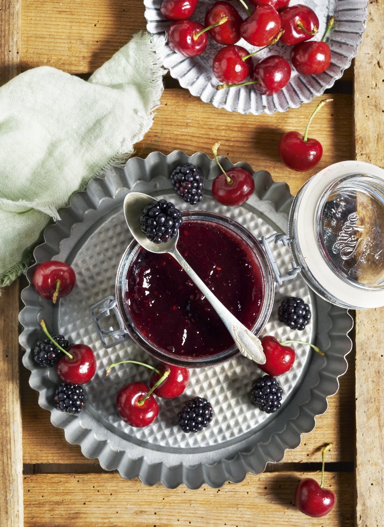 Traumhaftes Fruchtduo im Glas: Der Brombeer-Kirsch-Aufstrich ist dank Gelierzucker 2:1 weniger süß und vereint die leicht herbe Brombeere mit fruchtigen Sauerkirschen.