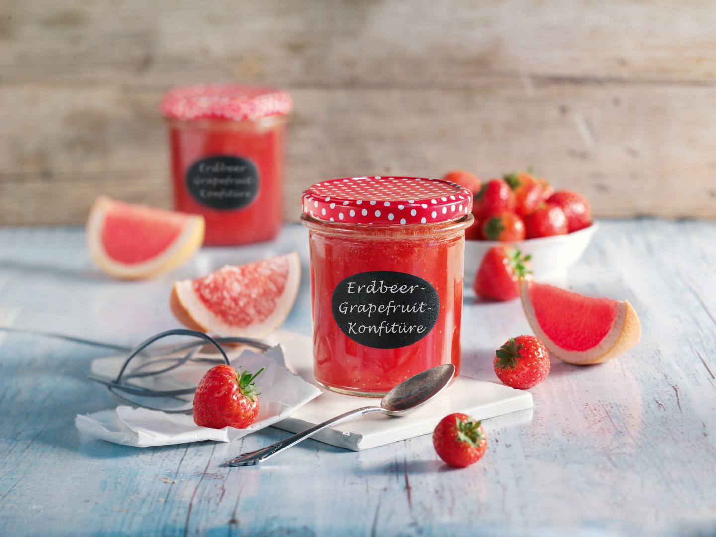 Erdbeeren waschen, putzen und in Stücke schneiden. Grapefruit heiß abwaschen, abtrocknen und Schale fein abreiben. Dann schälen und filetieren. Beides pürieren und insgesamt 1 kg abwiegen.