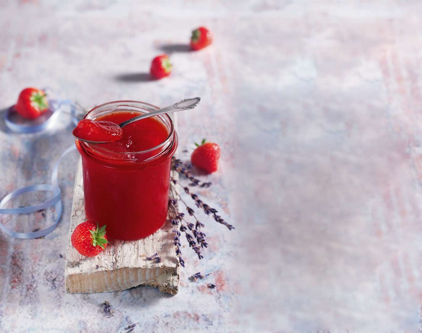 Erdbeeren waschen, putzen, pürieren und 1 kg abwiegen. Lavendelblüten auf zwei Teefilter verteilen und zubinden.