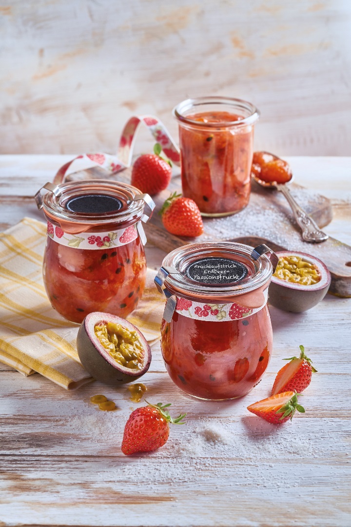 Exotische Passionsfrucht verleiht dem Fruchtaufstrich mit süßer Erdbeere genau die besondere Note, die das Frühstücksbrot zu einem Genuss der Extraklasse macht.