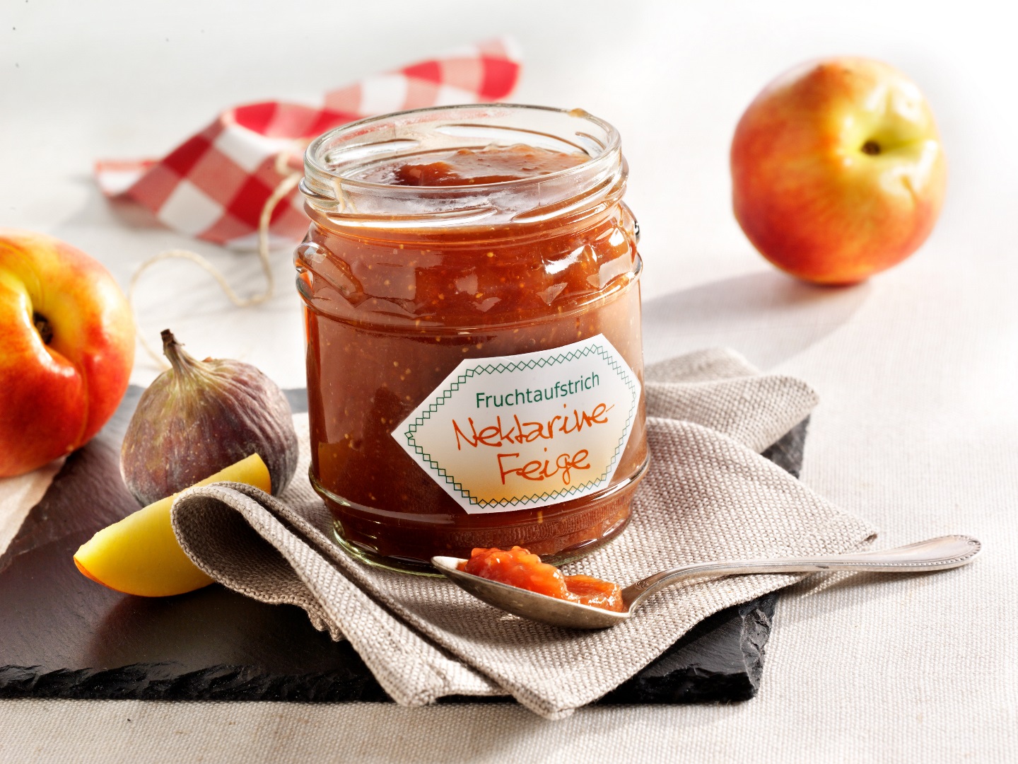 Nektarinen waschen und entsteinen. Feigen waschen und entstielen. Früchte pürieren und insgesamt 1500 g abwiegen.