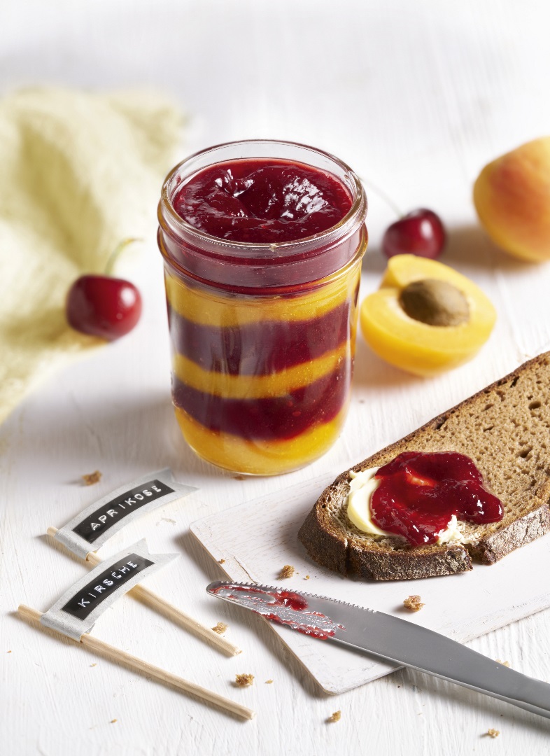 Starkes Früchte-Paar mit einem besonderen Twist: Roter und gelber Aufstrich werden nicht gemixt, sondern im Glas abwechselnd aufeinandergeschichtet – das ist Doppeldecker-lecker.