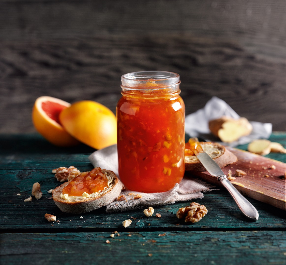 900 g Grapefruits, Ingwer und Walnüsse mit Diamant Gelierzucker 1:1 in einem großen Topf mischen und unter Rühren zum Kochen bringen.