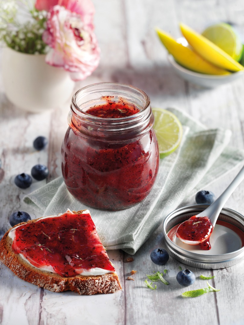 Exotische Mango und süße Heidelbeeren verbinden sich bei diesem Fruchtaufstrich zu einer fruchtigen Köstlichkeit – und das ganz ohne kochen. Für Extra-Frische sorgen Limettenzesten.