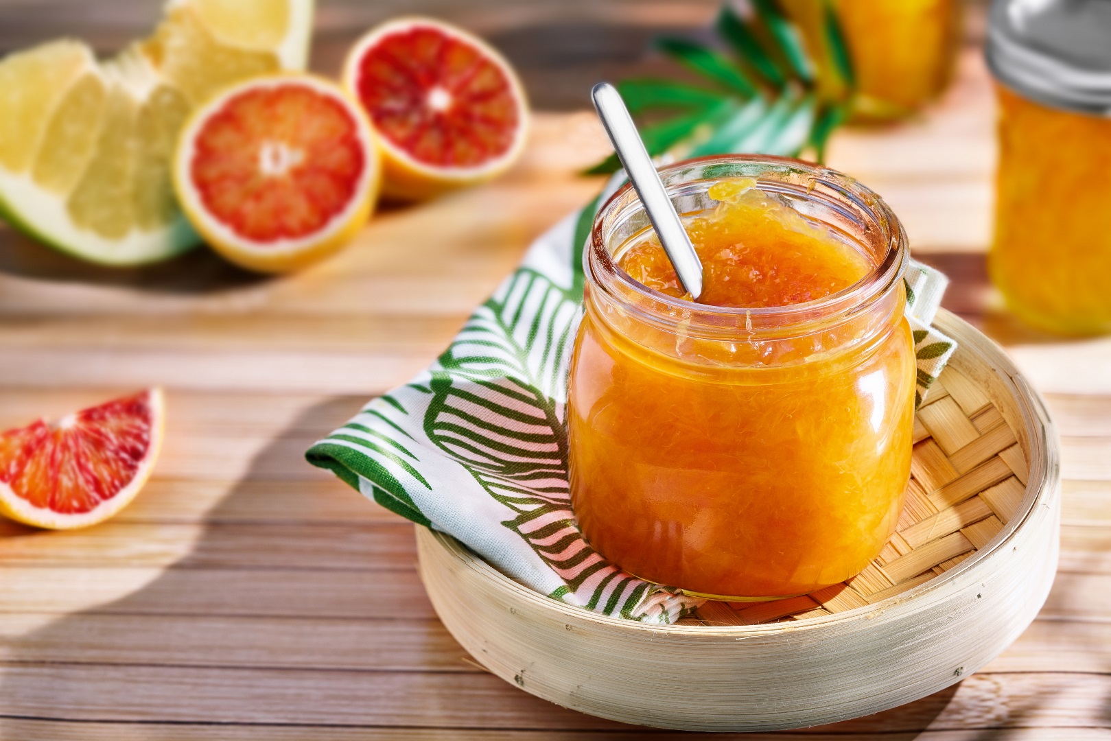 Pomelo schälen und das Fruchtfleisch zwischen den weißen Trennhäuten herauslösen. Saft der Blutorangen auspressen.