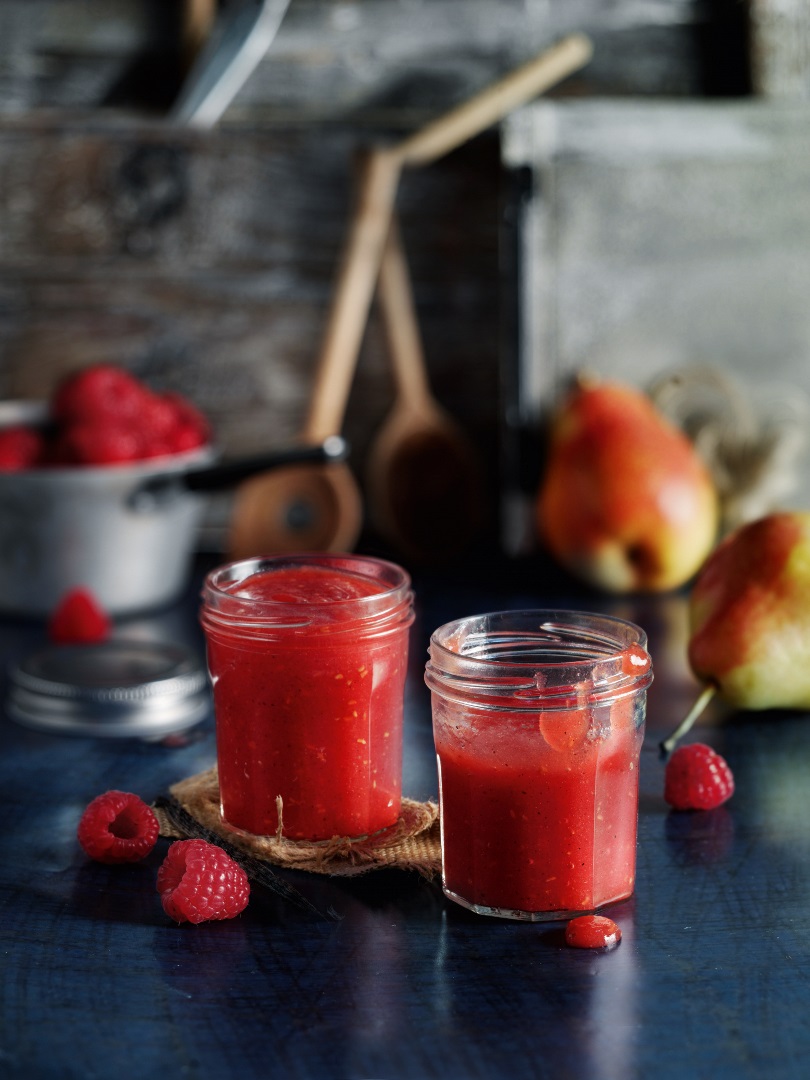 Himbeeren waschen und putzen. Birnen waschen, entkernen und in Stücke schneiden. Mark der Vanilleschote herauskratzen. Obst und Vanillemark in ein hohes Gefäß geben.