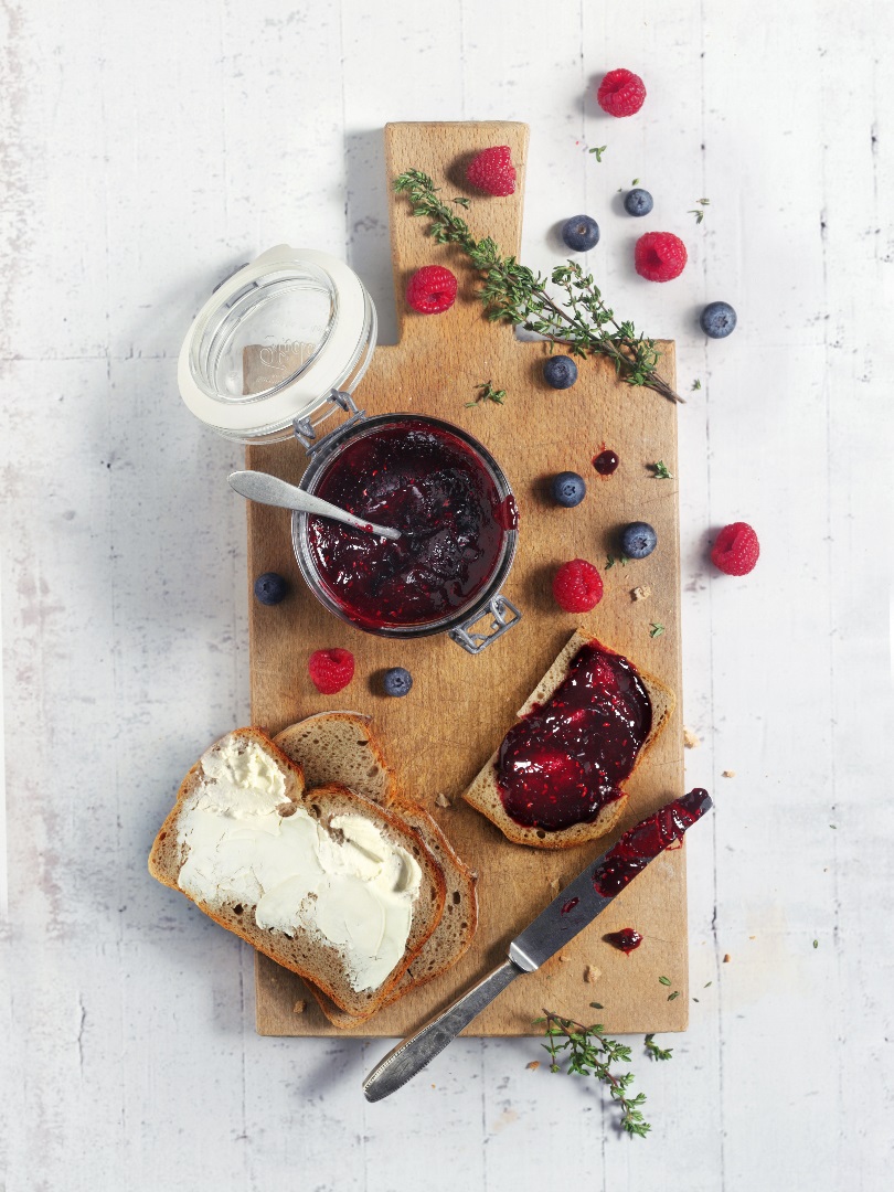Heidelbeeren und Himbeeren verbinden sich in dieser Konfitüre zu einem beerigen Vergnügen. Thymian verleiht die besondere Note und rundet den Aufstrich perfekt ab.
