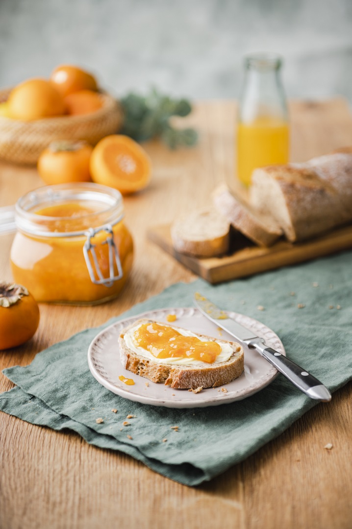 Kakis waschen, Stiel entfernen und in Stücke schneiden. 700 g abwiegen und zusammen mit dem Orangensaft pürieren.