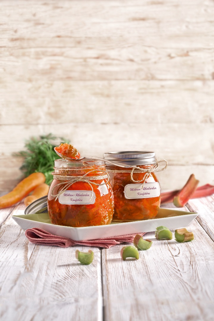 Die Konfitüre aus Möhre und Rhabarber klingt ungewöhnlich – und schmeckt doch herrlich frisch und einfach lecker. So leicht wird das morgendliche Brötchen zum echten Genuss.