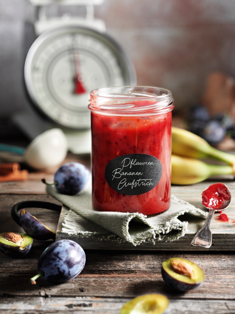 - Für die Zubereitung des Rezeptes im normalen Kochtopf Pflaumen waschen und entsteinen, Bananen schälen. Beides pürieren und insgesamt 1 kg Fruchtpüree mit 500 g klassischem Diamant Gelierzucker 2:1 in einem großen Topf mischen. Unter Rühren zum Kochen bringen und bei starker Hitze unter Rühren 3 Minuten sprudelnd kochen lassen. Achtung: Gut rühren, da es leicht anbrennt. In Gläser füllen und gut verschließen.