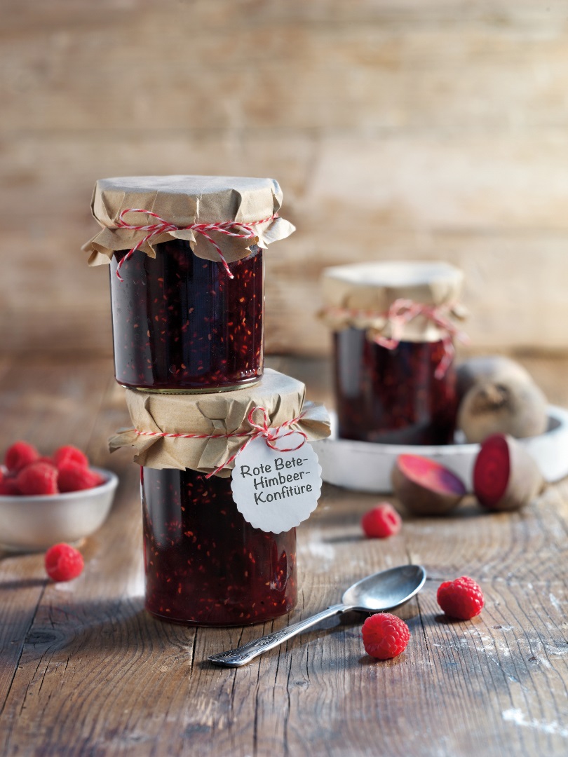 Rote Bete und Himbeeren mit Diamant Gelierzucker 1:1 in einem großen Topf mischen und unter Rühren zum Kochen bringen.