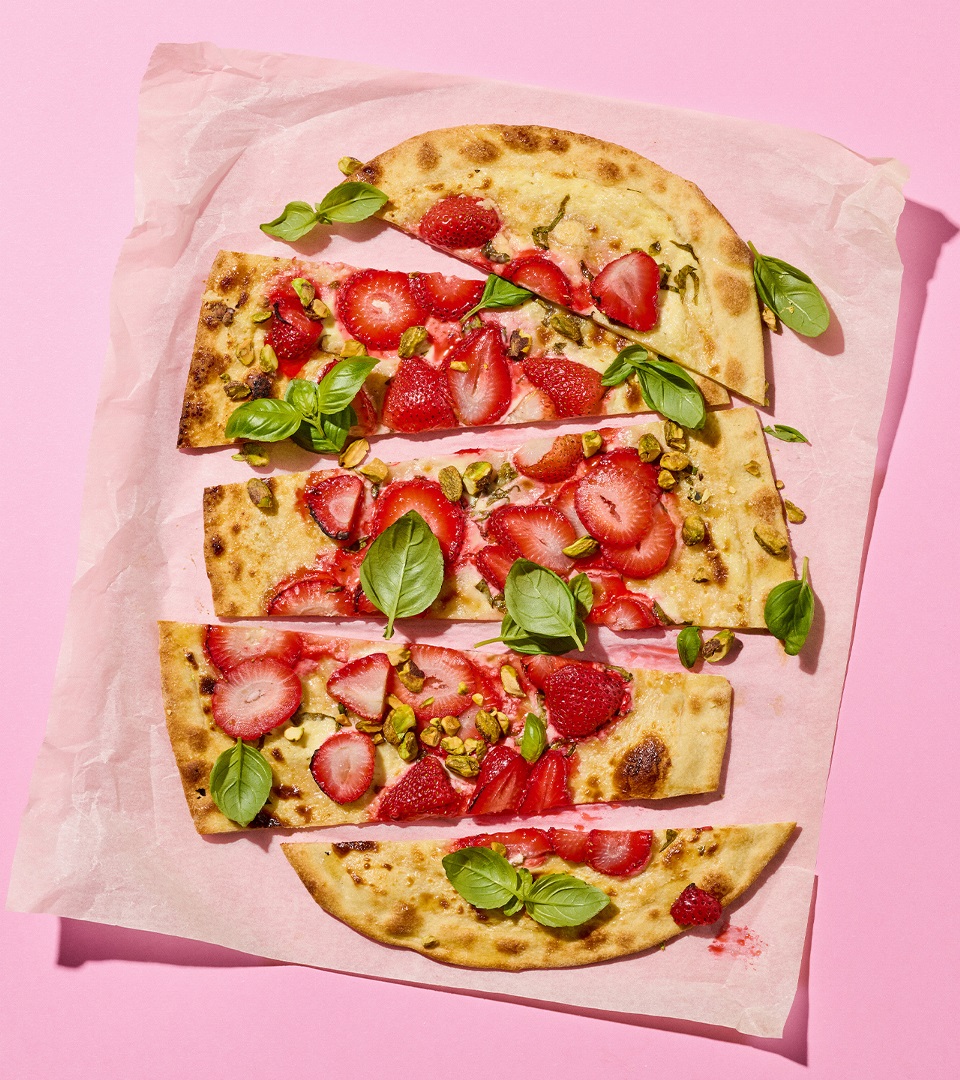 Mit Creme bestreichen, Erdbeeren und Basilikumstreifen darauf verteilen mit je 1 EL Diamant Brauner Zucker bestreuen und nacheinander 10–12 Minuten backen.