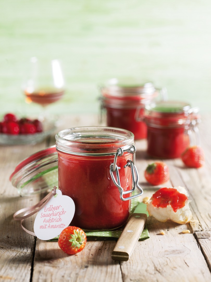 Im Glas verlängern wir die Sauerkirschen- und Erdbeerzeit: Der aromatische, tiefrote Aufstrich aus den beliebtesten Sommerfrüchten – verfeinert mit einem Schuss Mandellikör – schmeckt einfach himmlisch!