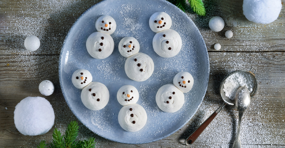 Es gibt etwas, das selbst den Weihnachtsmann ins Schwärmen bringt. Denn gerade in der Weihnachtszeit lieben alle süße Baisers, die ganz einfach aus übrig gebliebenem Eiweiß und Zucker gemacht werden. Beides zusammen steif schlagen und im Ofen trocknen lassen. So wie bei unseren Baiser-Schneemännern, die nicht nur im Winter alle luftig um den Finger wickeln. Mit ein wenig Kreativität können sie auch andere Formen annehmen und passen so in jede Jahreszeit.