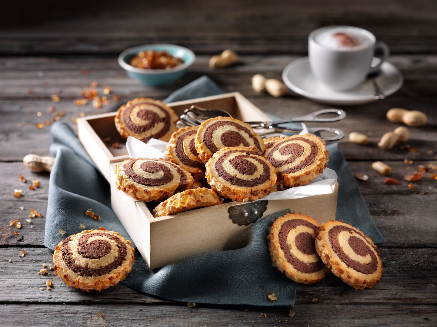 Hellen und dunklen Teig separat rechteckig ausrollen (ca. 40 x 25 cm). Dann übereinanderlegen und von der Längsseite her aufrollen.