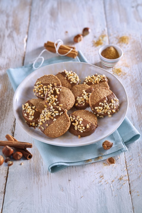 Mehl, Diamant Brauner Zucker, Eigelb, Salz, Zimt, Kakao und Nüsse in eine Schüssel geben. Butter dazugeben und zu einem festen Teig verkneten. Aus dem Teig eine Rolle (etwa 3,5 cm Ø) formen, in Folie wickeln und eine Stunde im Kühlschrank ruhen lassen.