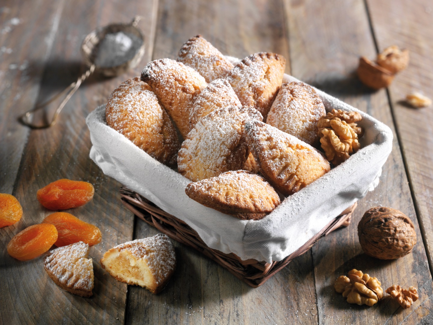 Walnuss-Aprikosen-Taschen nach dem Abkühlen mit Diamant Puderzucker bestäuben.