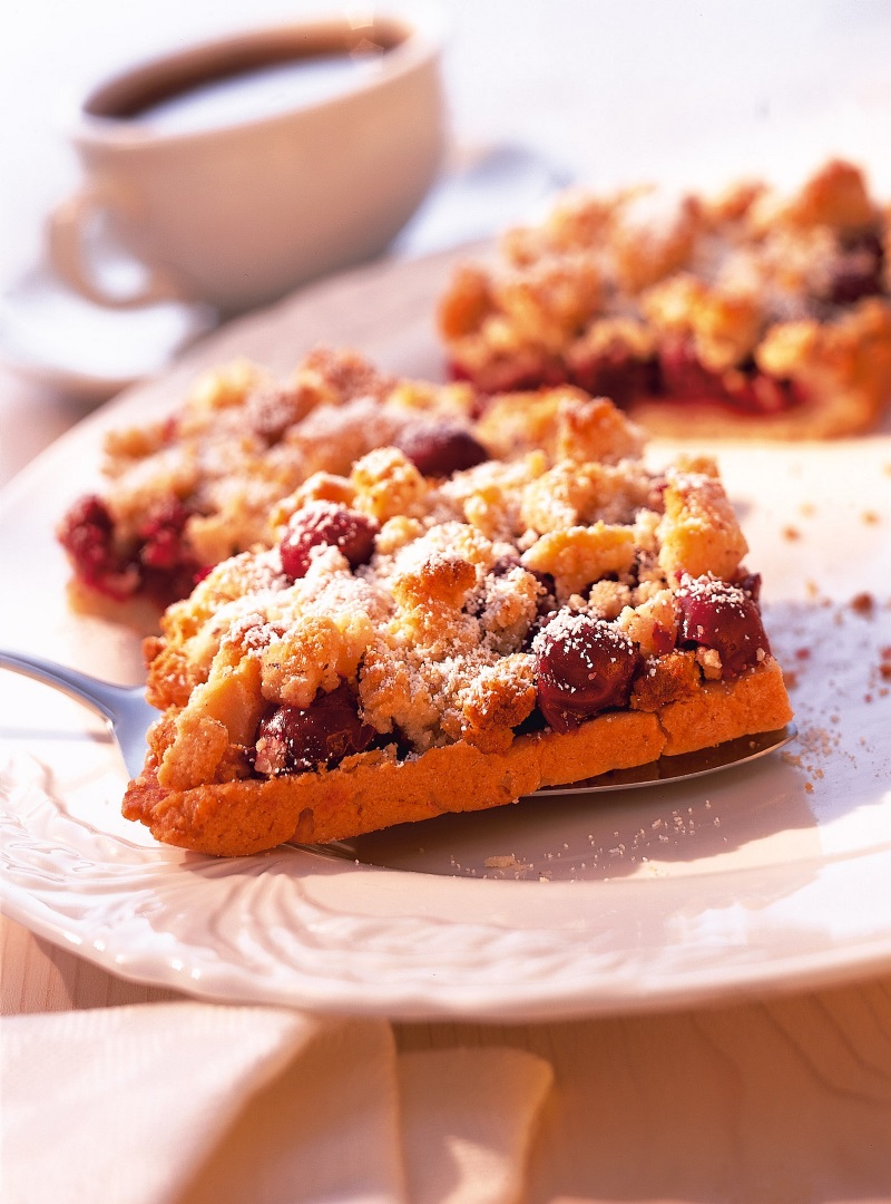 Den Teig kurz durchkneten und auf einem mit Backpapier belegten Backblech ausrollen. Mit einer Gabel gleichmäßig einstechen. Die abgetropften Preiselbeeren und Sauerkirschen auf dem Teigboden verteilen und mit den Streuseln bestreuen.