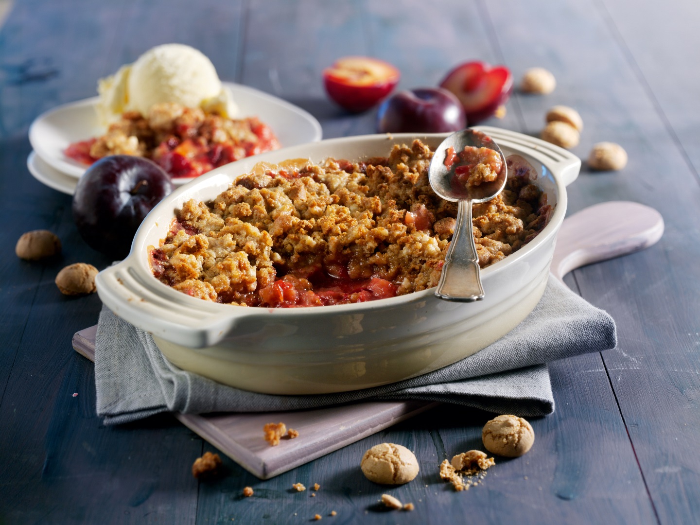 Für die Streusel Butter mit Diamant Brauner Zucker, Zimt, Salz und Mehl verrühren. Amarettini grob zerbröseln, zusammen mit den Mandeln dazugeben und die Masse mit den Händen zu Streuseln verkneten. Streusel auf den Zwetschgen verteilen.