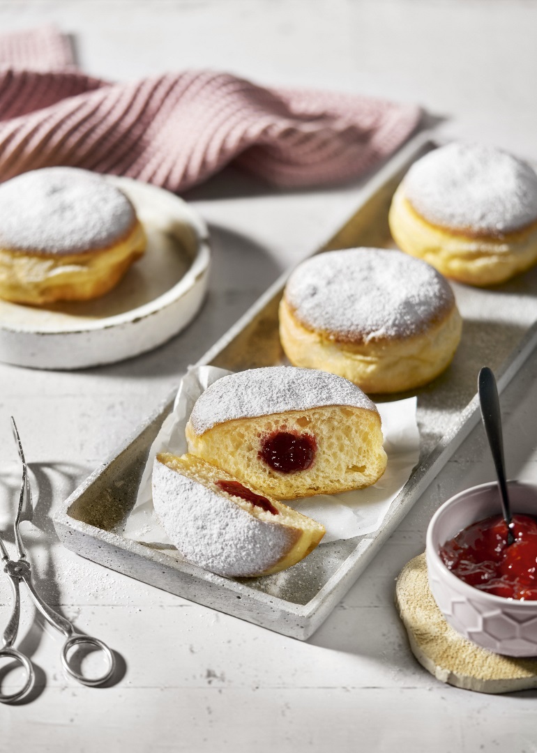 Hm, frische Berliner ganz einfach selbst gemacht mit Marmeladenfüllung! Dank Diamant Zierschnee schmilzt die schöne weiße Puderzuckerdeko nicht weg! Perfekt für Karneval, Fasching und auch sonst!