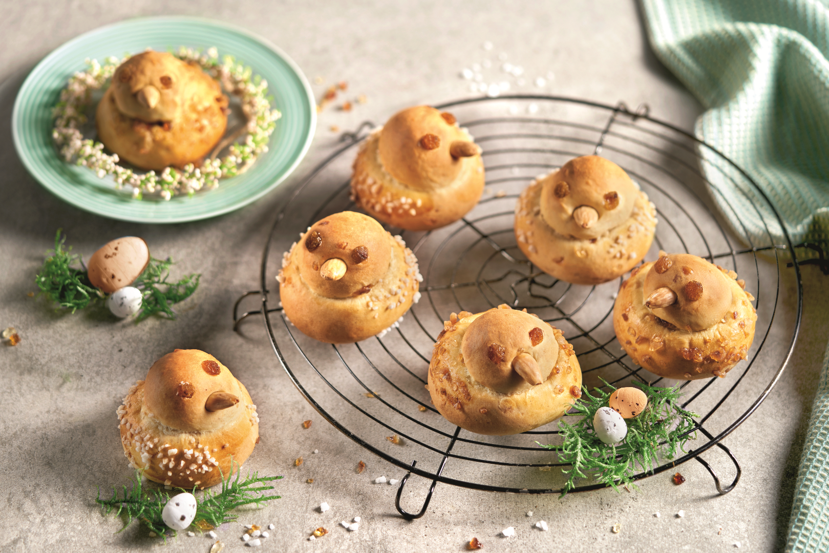 Eigelb mit Milch verrühren und Küken damit einpinseln. Den „Rücken“ mit Diamant Grümmel Kandis bestreuen.