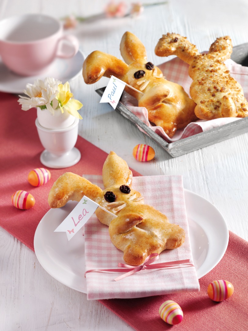 Teig auf einer bemehlten Arbeitsfläche ca. 5–10 mm dick ausrollen. Mit einer Schablone oder einem Ausstecher Häschen ausstechen.