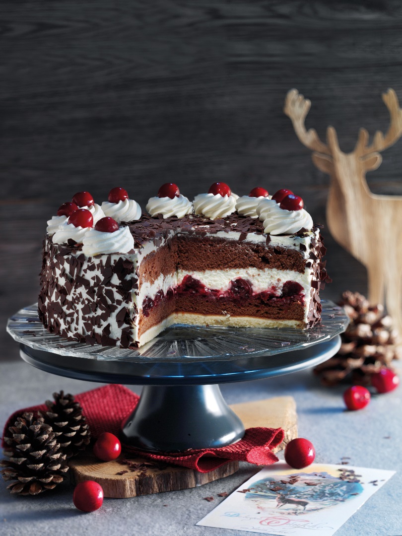 Für die Kirschfüllung die Kirschen abtropfen lassen, Saft auffangen. 125 ml Kirschsaft erhitzen, Speisestärke mit etwas kaltem Saft anrühren, in den kochenden Saft rühren und einmal aufkochen lassen. Etwas abkühlen lassen, dann Kirschen und Kirschwasser untermischen. Nach dem völligen Erkalten die Füllung auf dem Biskuitboden verteilen.