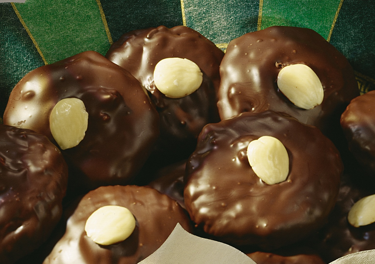 Kuvertüre hacken, im heißen Wasserbad schmelzen und Lebkuchen nach dem Abkühlen damit bestreichen und mit je 1/2 Mandel verzieren.