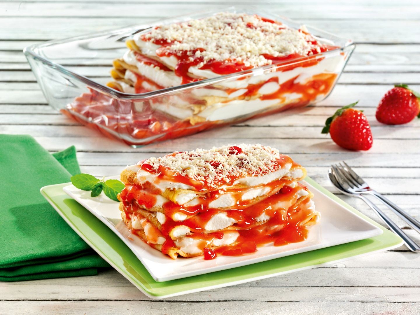 Das perfekte Frische-Dessert: Die Erdbeer-Lasagne mit Schichten aus Crêpes, sahniger Frischkäsecreme und Erdbeersoße ist ganz einfach zu machen und köstlich fruchtig-frisch!