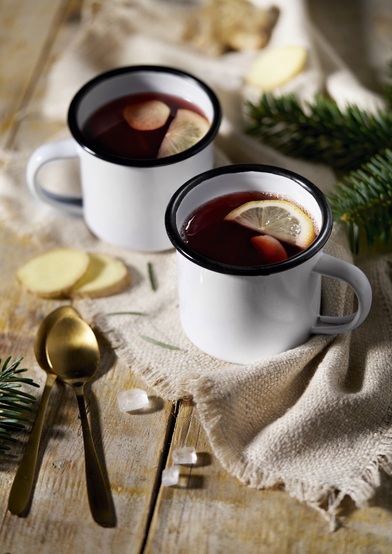 Ingwer zusammen mit Zitronenscheiben, Diamant Weißer Kandis, Teebeutel und Sauerkirschnektar in einen Topf geben.