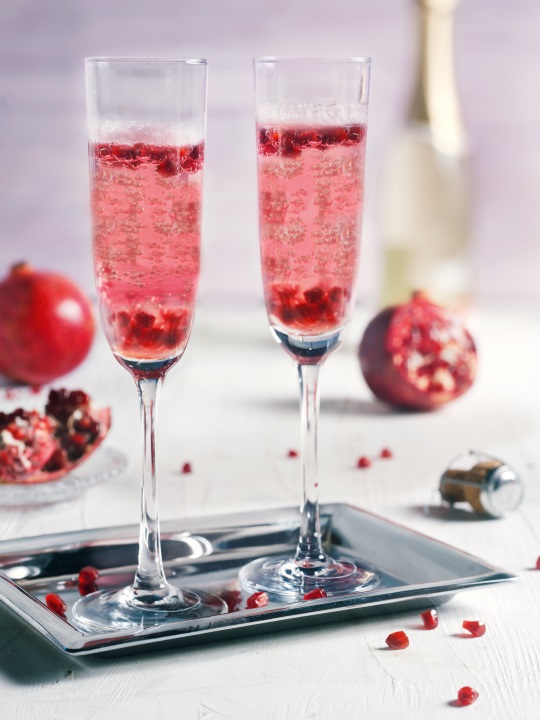 Granatapfelkerne und Sirup auf Gläser verteilen und mit Crémant auffüllen.