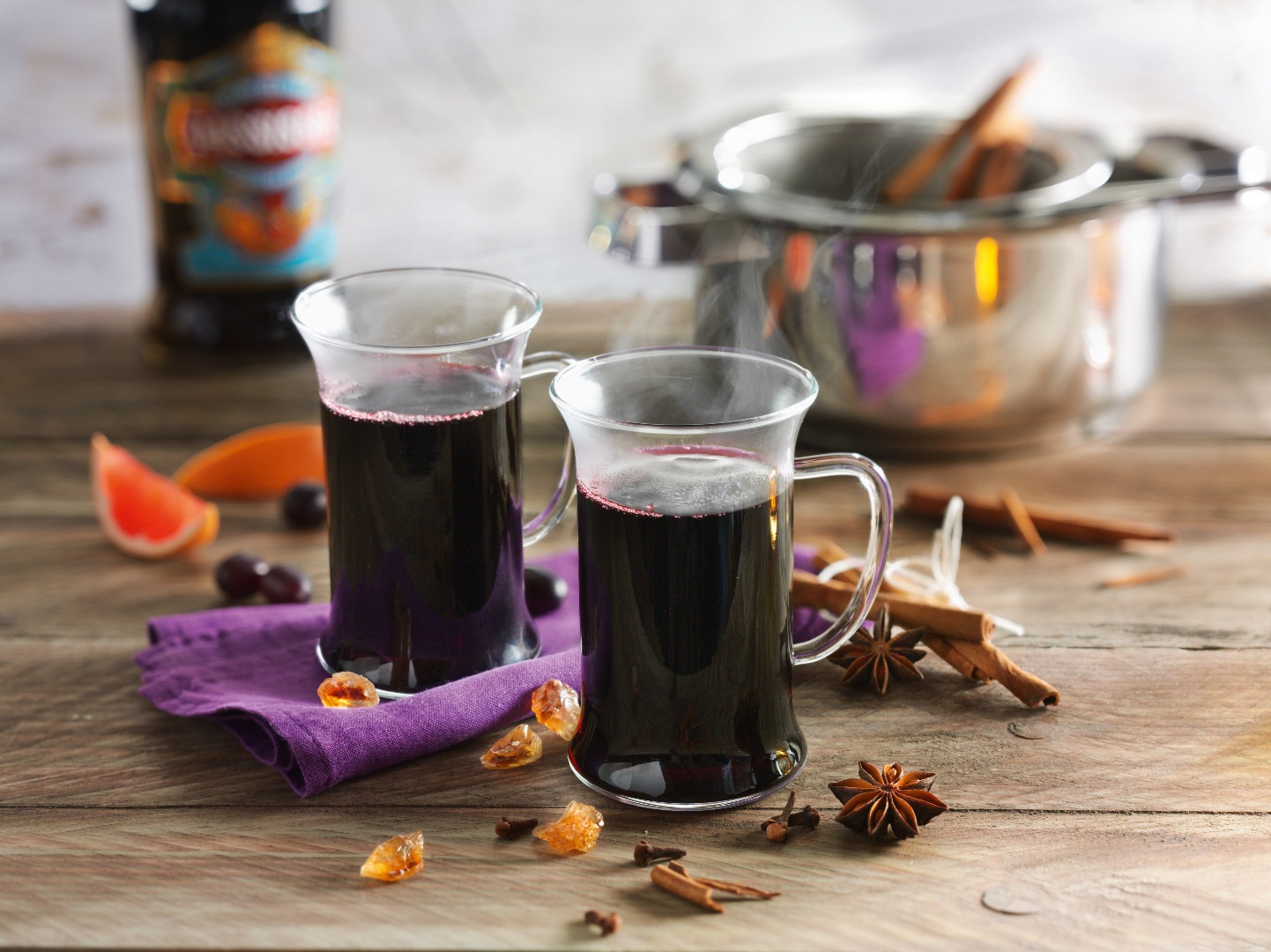 Alle Säfte mit Gewürzen und Diamant Krusten Kandis in einen Topf geben und langsam erhitzen, aber nicht kochen. 10 Minuten ziehen lassen.