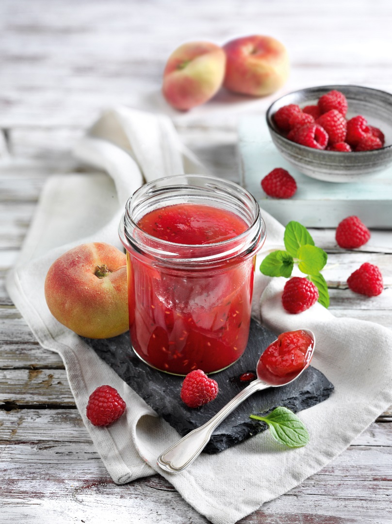 Aromatische Weinbergpfirsiche und säuerliche Himbeeren, abgerundet mit frischer Minze - ein besonderer Genuss auf dem Frühstücksbrötchen!