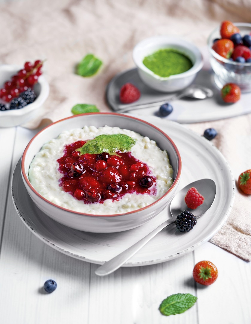Risotto mit Beeren-Chutney und Minzpesto anrichten.