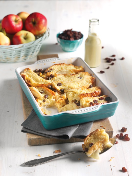Die Masse umrühren und die Hälfte davon in eine gefettete Auflaufform füllen.