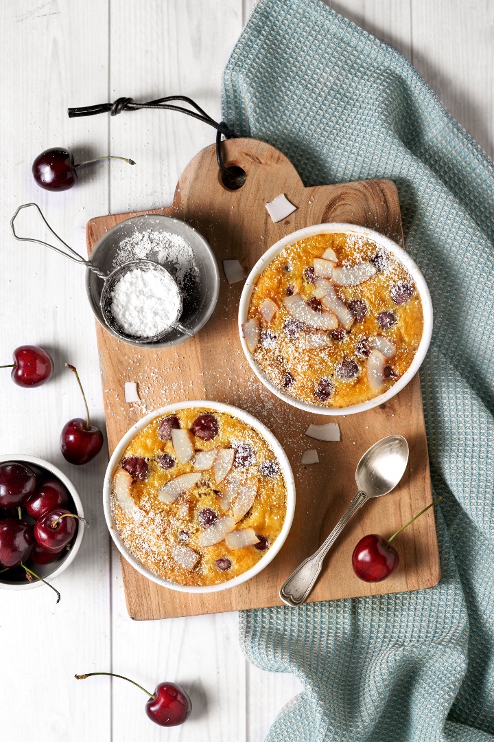 Den Teig in kleine, gefettete Auflaufformen (ca. 12 cm Ø) füllen. Kirschen darauf verteilen und mit Kokos-Chips bestreuen.