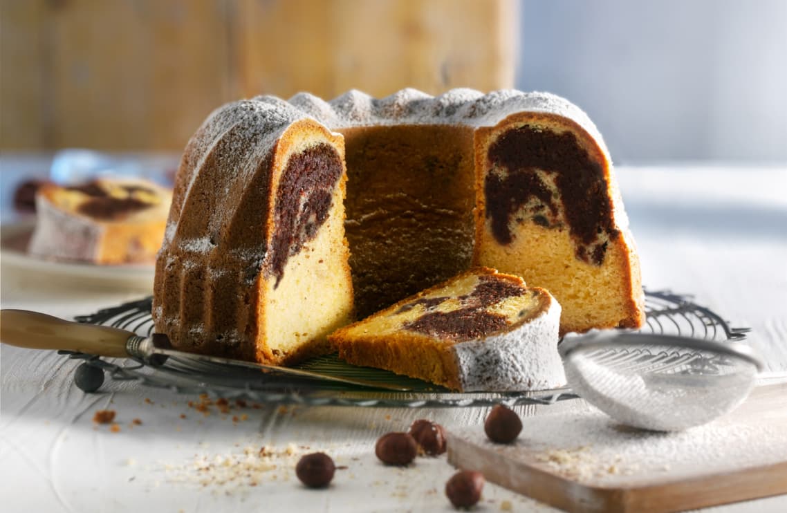 Du liebst klassische Backrezepte aus Omas Zeiten? Dann probiere diesen leckeren Marmorkuchen mit gemahlenen Haselnüssen.