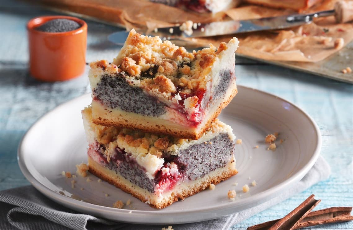 Ein echtes Highlight für alle Blechkuchen-Fans ist dieser saftige Kleckskuchen mit Mohn, Streuseln und fruchtiger Kirschkonfitüre.