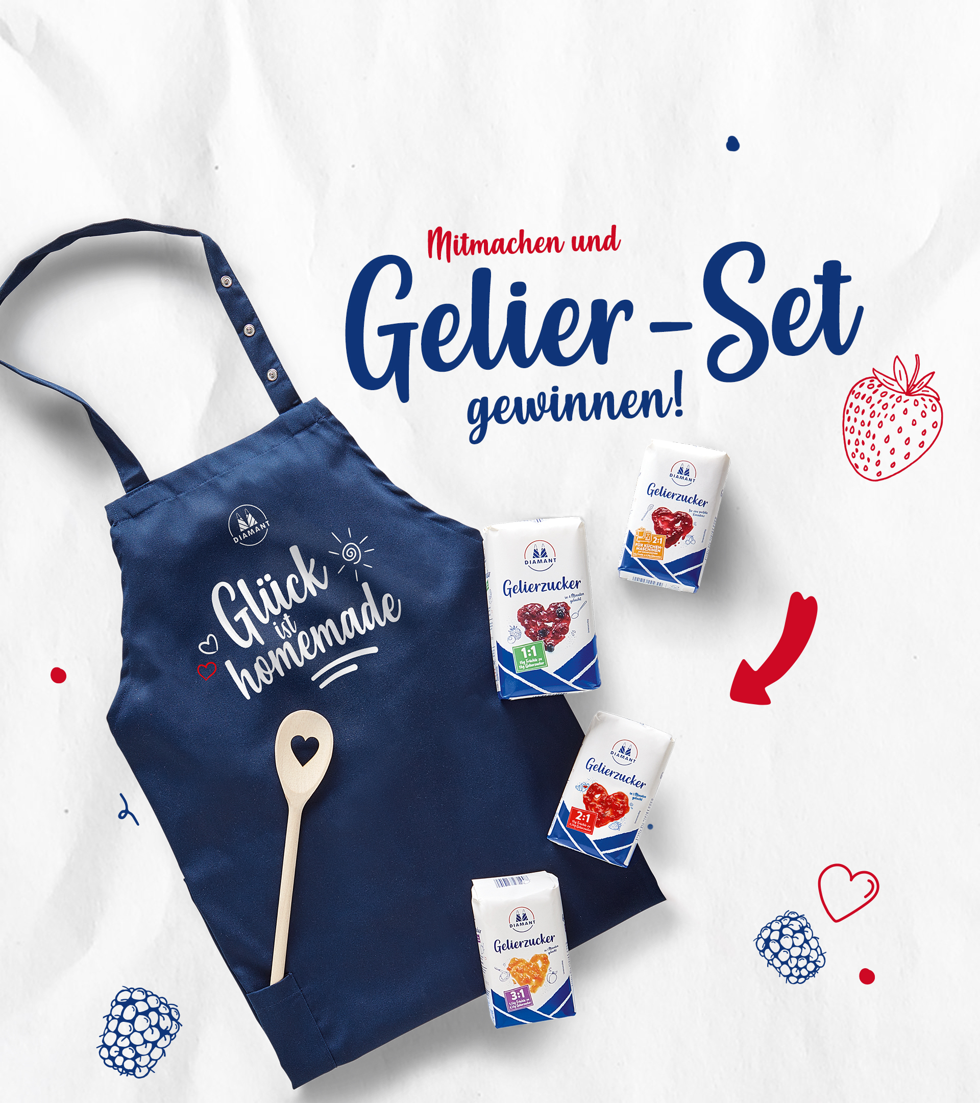 Unter allen Teilnehmern werden über 20 Wochen (19.05.2021 bis 05.10.2021) alle 4 Wochen 20 Gelier-Sets (jeweils bestehend aus 1 Diamant Schürze, 1 Kochlöffel und 4 Diamant Gelierzucker-Produkten) verschenkt. Der Teilnahmezeitraum beginnt jeweils am 19. jedes Monats um 00:00 Uhr, Einsendeschluss eines jeden Teilnahmezeitraumes ist der 18. des Folgemonats 23:59 Uhr. Der letzte Teilnahmezeitraum endet am 05.10.2021 um 23:59 Uhr. Soweit im Rahmen des Aufrufs zur Teilnahme die Preise bildlich dargestellt wurden, weist die Veranstalterin darauf hin, dass die tatsächlich verschenkten Gewinne nicht mit den abgebildeten Gegenständen identisch sein müssen, jedoch gleiche oder vergleichbare Eigenschaften aufweisen.